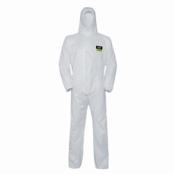 Einwegoverall Chemikalienschutz uvex 5/6 classic lightWeiß. Aus PP-Spinnvlies, mit PE-Folie laminiert. Optimale Passform dank Gummizügen an Taille, Kapuze, Armen und Beinen. Mittelfingerschlaufen verhindern ein Hochrutschen der Ärmel.