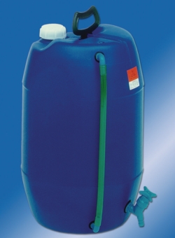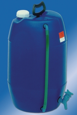 Blau, undurchsichtig (Lichtschutz). Mit Niveauanzeige und eingeschweißtem Hahn.