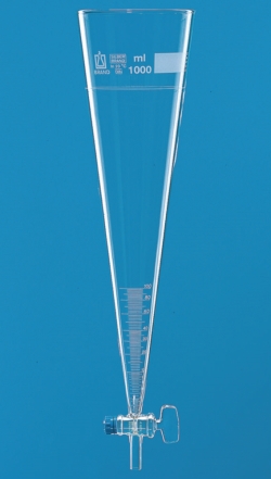 Sedimentiergefäße nach Imhoff, Borosilikatglas 3.3.DIN 12672. Graduierung und Beschriftung in kontraststarker weißer Emailfarbe. Ringmarke bei 1000 ml. | ||||||||||||||||||||||||||||||